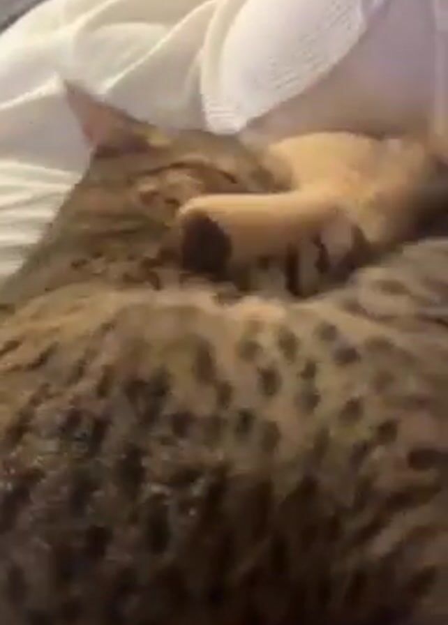 Here's a detailed description of the video: A person is lying on a bed with a brown, spotted cat nestled on top of them