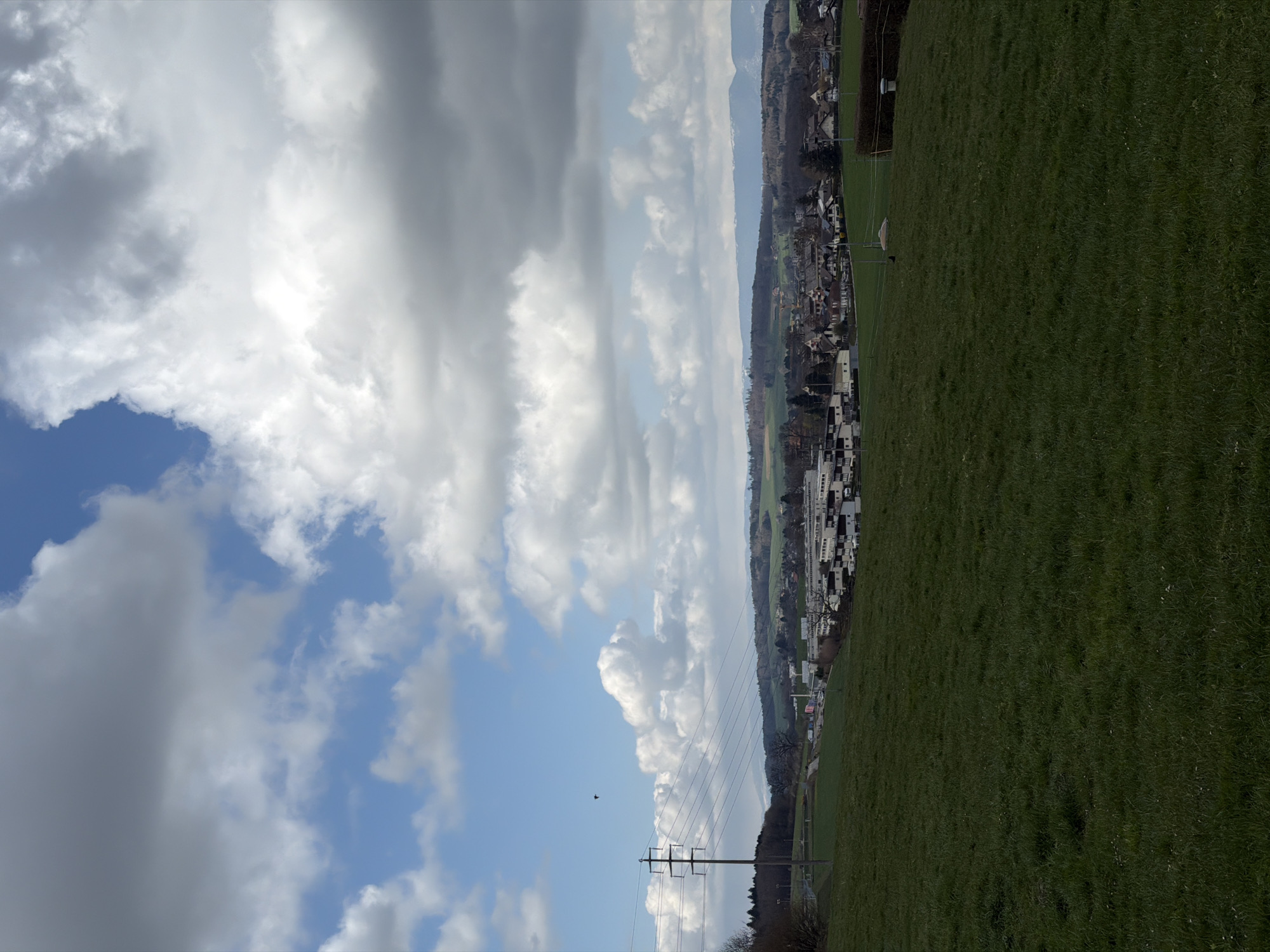 A wide-angle landscape photograph captures a panoramic view of an area identified as being in or around Fribourg - Freiburg, Switzerland, under a partly cloudy sky. The foreground consists of a gently sloping, vibrant green grassy field with small white flora. In the midground to the left, a tall utility pole with three cross-arms and multiple power lines extends horizontally towards the right. Below the power lines and partially obscured by a slight rise in terrain, a paved road or highway is visible, with a small cluster of bare-branched trees further left. The central midground features a developed area comprising a mix of structures: multi-story commercial or light industrial buildings with flat roofs (some white, some grey) and a cluster of residential-style houses with pitched roofs. A large, dark green hedge runs along the right side of the midground, and a small white cylindrical object, possibly a vent or marker, stands in the field. A small, dark, possibly animal, figure is also present in the field near the hedge. The background reveals rolling green hills with scattered patches of darker forest. In the far distance, a range of mountains with visible snow-capped peaks defines the horizon. The sky overhead is a dynamic mix of clear blue patches and large, fluffy cumulus clouds, varying from bright white to darker grey. A single small, dark bird is captured in flight in the upper-left quadrant of the sky. No human subjects or direct interactions are visible.