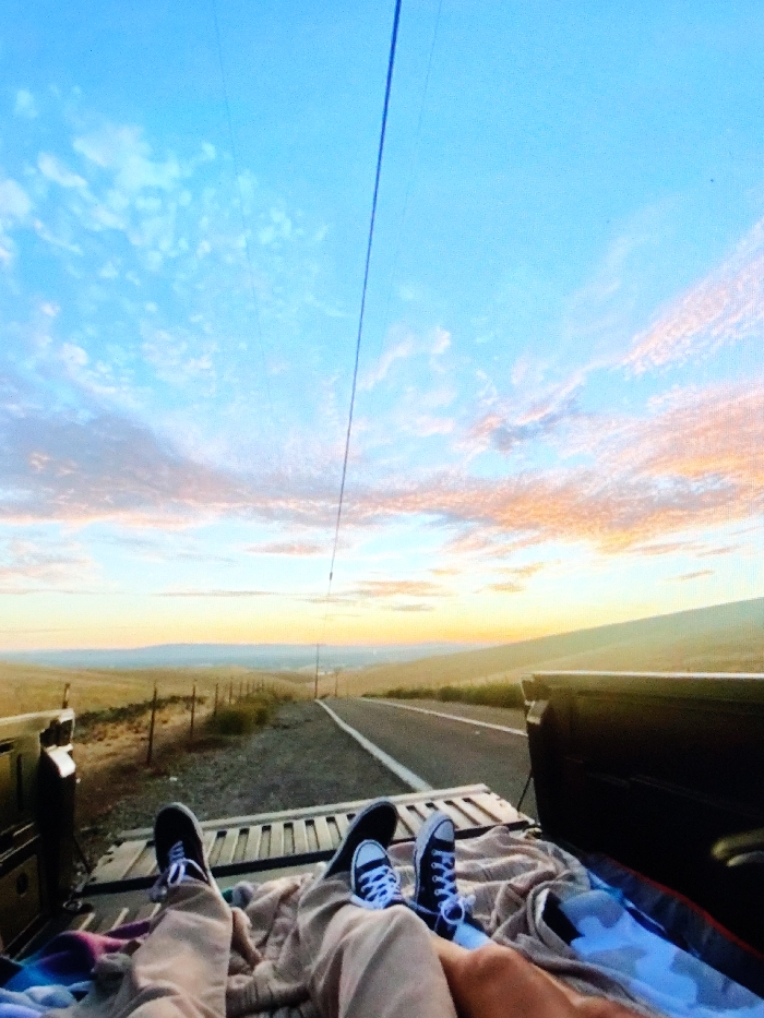 The image depicts a rural landscape at sunset or sunrise, viewed from the bed of a dark-colored pickup truck in Sysmä, Finland. Two individuals are positioned with their legs extended towards the horizon, their lower bodies covered by a light-colored blanket. Both are wearing black canvas sneakers with white laces. The truck's tailgate and ribbed bed floor are visible in the foreground. A paved road, featuring a white shoulder line, stretches into the distance, bordered on the left by a wire fence traversing dry, rolling hills covered in sparse vegetation. The sky displays a gradient from clear blue at the zenith to orange, pink, and yellow hues near the horizon, populated by scattered cirrocumulus clouds. A thin wire or power line traverses the upper sky, extending towards the distant horizon.