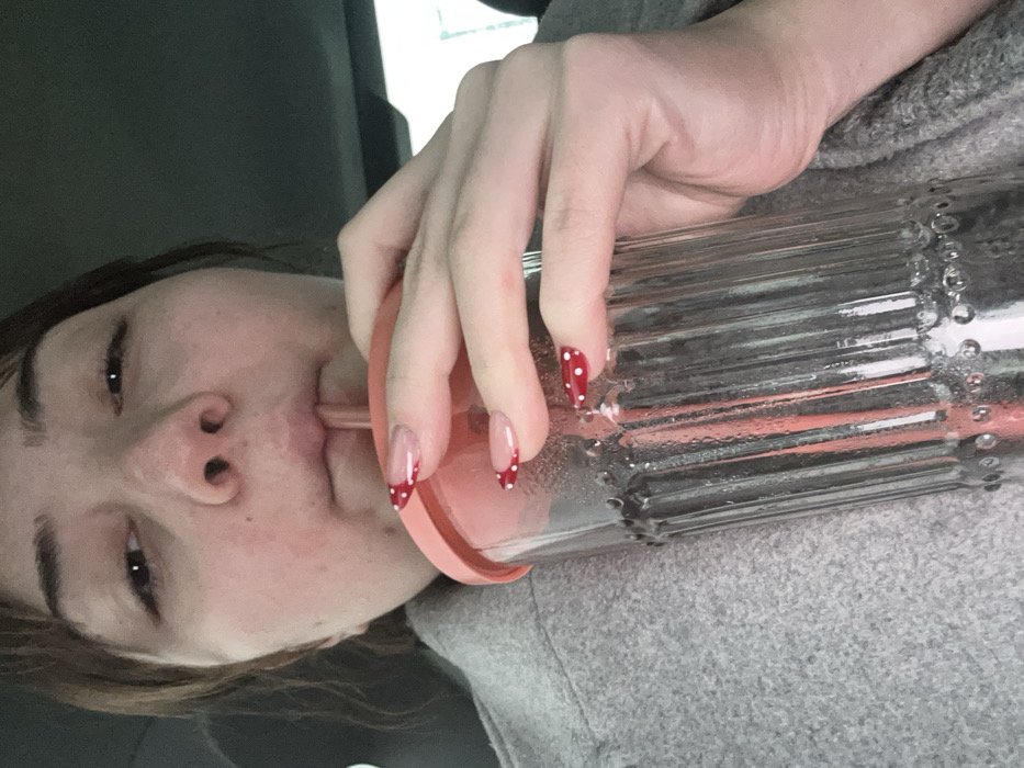 A young woman with light skin drinks from a clear, ribbed cup with a light pink lid and straw. Her hand, adorned with red and white polka-dot French-tipped nails, grips the cup. She wears a gray sweater, and a car window is visible in the background. Her face is turned toward the camera as she sips her drink.