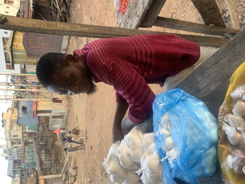 An adult male with dark skin and a short beard, wearing a maroon patterned long-sleeve shirt and light-colored pants, is seated behind a wooden counter in an outdoor setting in Okene, Nigeria