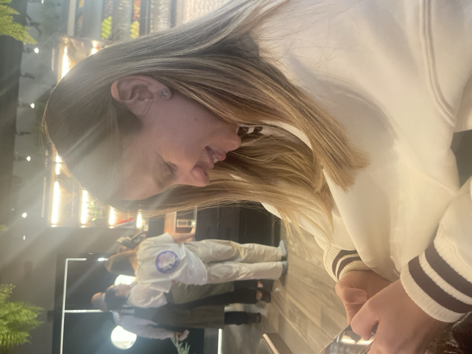 A woman with blonde hair and a white jacket is looking down at her phone. She is indoors, with others visible in the background. Her jacket has brown stripes on the sleeves. The background shows an indoor setting with artificial lighting. There appears to be a logo on the back of another person's shirt in the background. The picture is slightly blurry.