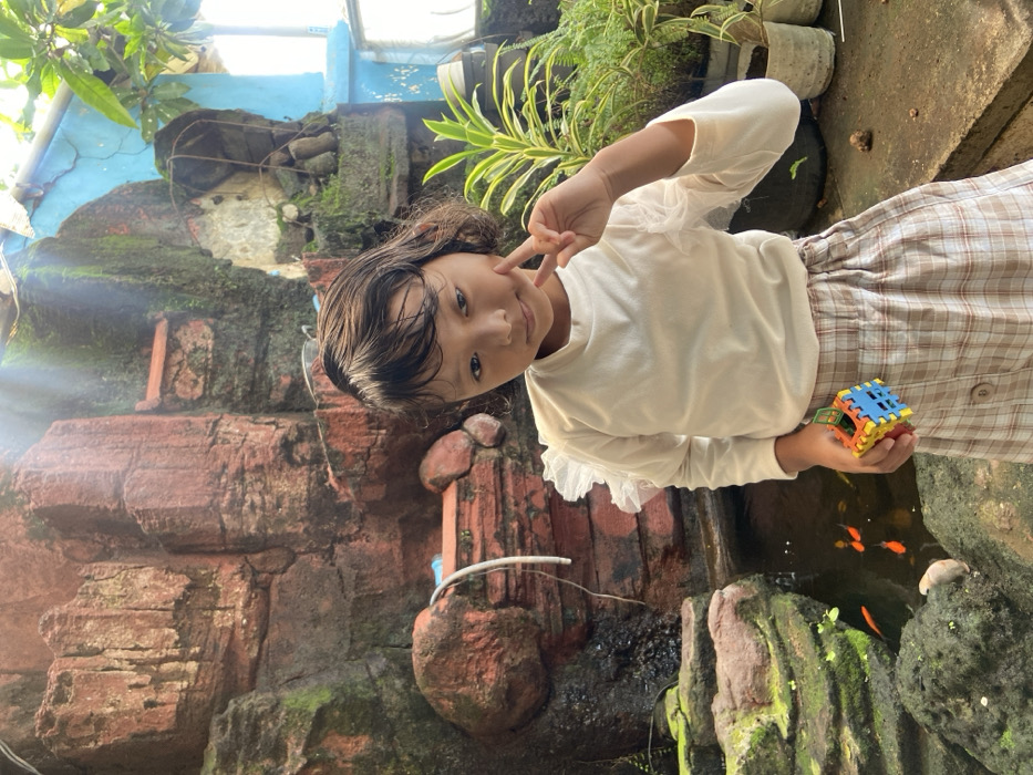 A young girl poses, holding a colorful cube-shaped toy, with a "peace" sign near her face. She wears a white long-sleeved shirt and a plaid skirt. Behind her is a rock formation with green moss, a small pond containing goldfish, and various potted plants. The scene is outdoors, bathed in sunlight.