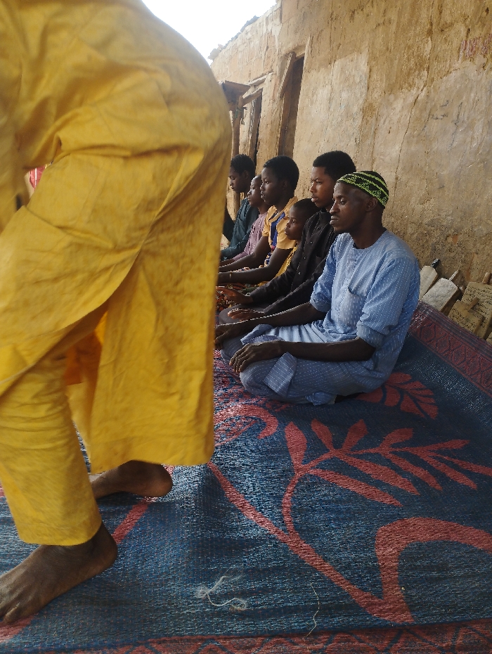 In Pantame, Nigeria, an outdoor scene shows six individuals seated on a blue and red patterned mat, positioned against a light brown, textured wall with two rectangular openings
