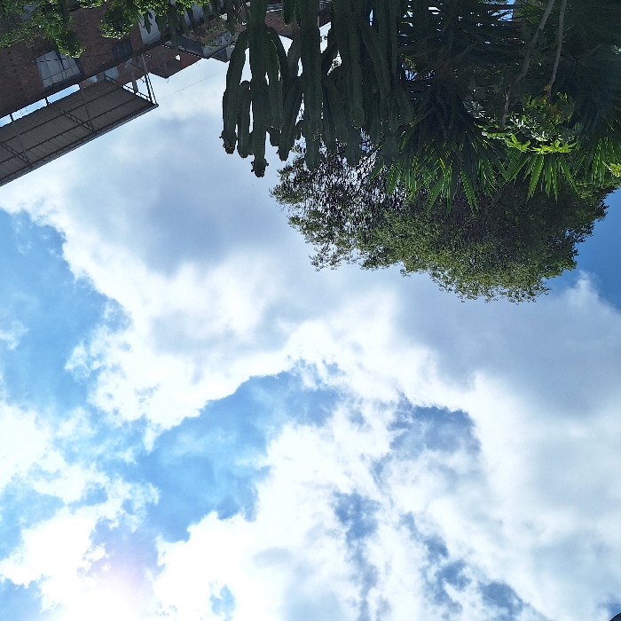 - "The scene is an outdoor daytime environment in Unknown, Unknown, captured from a low angle looking towards a partly cloudy blue sky with a visible sun and lens flare in the upper right" by FM-b0Aw43, licensed under CC BY 4.0