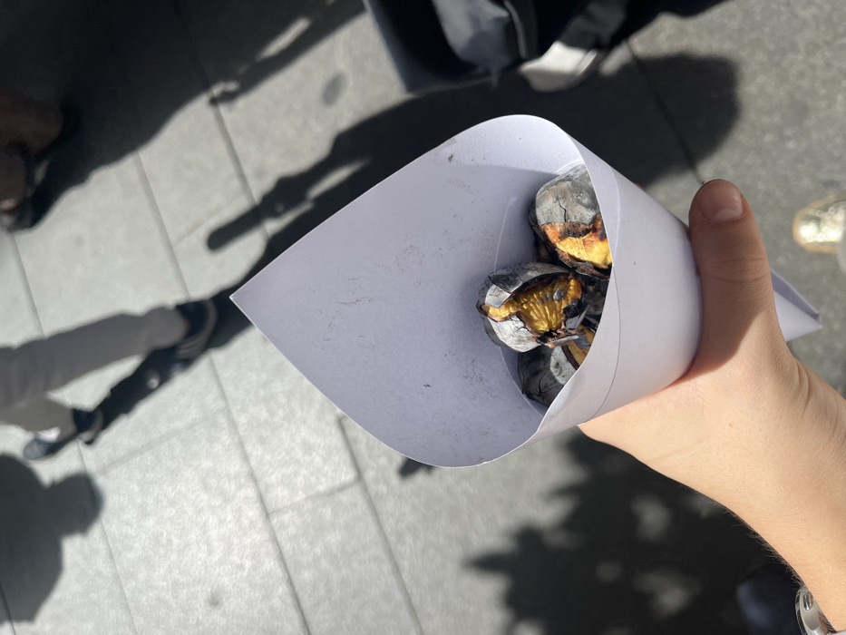 A light-skinned hand, likely belonging to an adult, holds a white paper cone containing approximately five roasted chestnuts