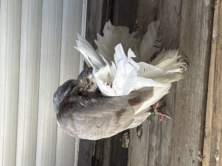 - "In Razlog, Bulgaria, a grey-brown domestic pigeon with reddish-brown patches on its body is positioned on a weathered wooden plank surface" by FM-CCOQt1, licensed under CC BY 4.0