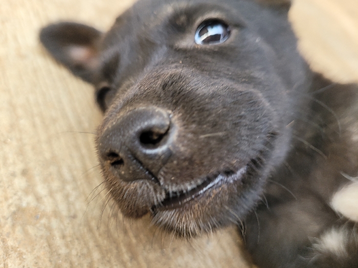 - "The image presents a close-up, low-angle view of a young canine, identified as a puppy, resting on a light-colored, textured surface" by FM-3V0yW2, licensed under CC BY 4.0