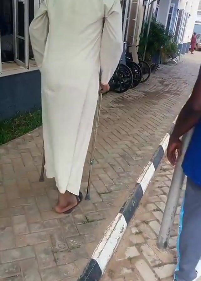 A man in a white robe and black sandals uses two crutches to walk along a covered walkway. He is accompanied by a second man wearing a blue basketball jersey and track pants. The walkway is paved with reddish-brown bricks laid in a herringbone pattern. There's a white and black striped curb or barrier along the walkway. Wheelchairs are parked near the walkway. As the man walks further along the walkway, vehicles and a few people can be seen in the background.