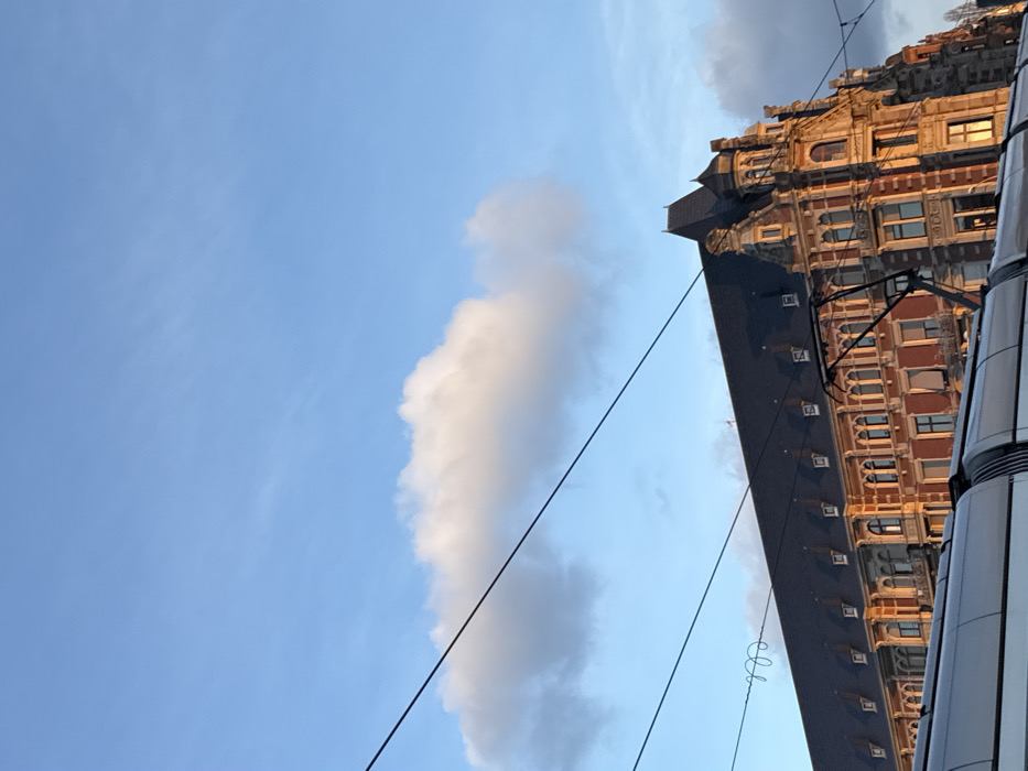 A wide shot captures the upper facade and roof of the Palais de Justice in Strasbourg, France, positioned in the lower-middle and right sections of the frame. The building exhibits ornate reddish-orange brickwork and stone detailing, with numerous rectangular windows, some featuring decorative surrounds. Its dark, steeply pitched slate roof includes multiple dormer windows. The far-right corner of the building features a more elaborate, turret-like structure. The building's visible surfaces are illuminated by warm, golden sunlight, indicating late afternoon or early evening. Above the building, a light blue sky dominates the upper portion of the image, sparsely populated by a single, elongated white cloud situated slightly above the building's roofline. Several black electrical wires, likely for a tram, crisscross the sky, one displaying a distinct coil pattern. The upper section of a modern, silver-colored tram, including part of its roof and pantograph, is visible in the lower foreground, partially obscuring the building's lower levels. No individuals are discernible within the frame.