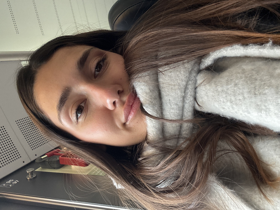 The image presents a close-up portrait of a female individual inside a passenger vehicle, likely a train or bus. The individual, with dark brown hair and light brown eyes, is positioned facing the camera, displaying a gentle smile. She is wearing a light gray, knitted scarf wrapped around her neck and lower face, her head resting slightly on the scarf. Behind her to the left, the vehicle's interior wall features a light-colored panel with horizontal ventilation grilles and small circular perforations. A silver coat hook is visible on this panel, with a red object, possibly a strap or garment, hanging from it. Faint alphanumeric markings "96" and "97" are visible above the hook. To the right, a dark, possibly leather or synthetic, seatback is partially visible. The lighting is even, suggesting ambient light. The scene's specific location within Petrovaradin, Serbia, is not visually identifiable beyond its setting within a vehicle consistent with public transportation.