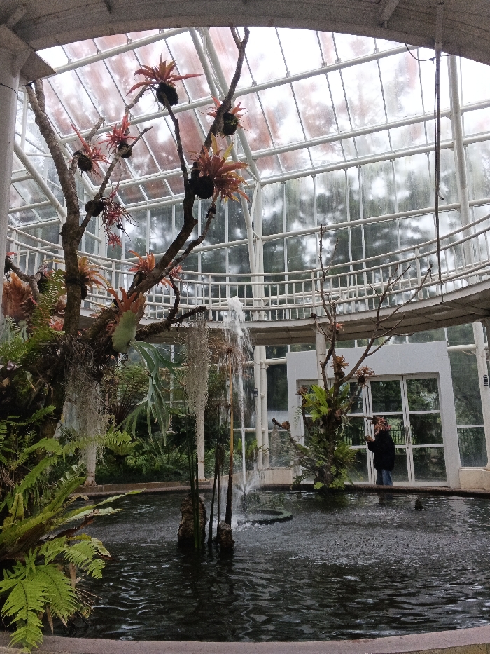 Inside a greenhouse with a white frame and glass panels, a circular pond features a fountain with water jets. Lush greenery surrounds the pond, including ferns and bromeliads attached to tree branches. A walkway spans above the pond, and a person wearing a dark jacket and jeans stands near the pond's edge. The greenhouse's transparent ceiling reveals an overcast sky.