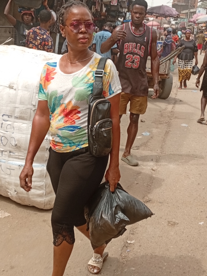 A woman in pink-tinted aviator sunglasses, a floral shirt, and black capri leggings carries a black bag in a bustling market. A man in a Bulls jersey walks nearby, pulling a cart. The market has numerous vendors and shoppers with various goods on display, like bags and clothes. The scene is lively with many people, suggesting a busy day in the market. The street is unpaved and dusty.
