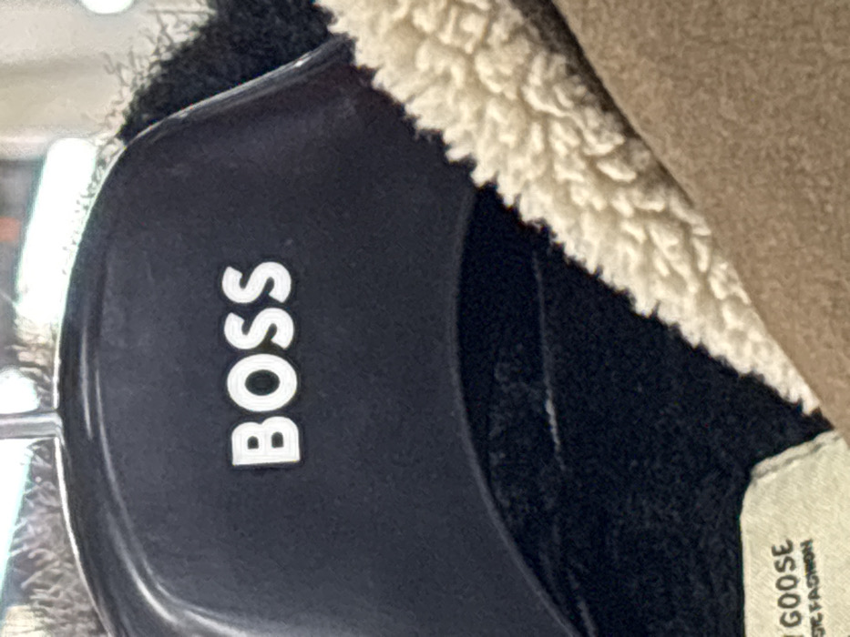 The scene depicts a close-up view within a retail clothing establishment in Pleven, Bulgaria. A dark-colored plastic garment hanger, centrally embossed with the raised white capital letters "BOSS", is prominently displayed. This hanger supports a dark garment, the interior of which is visible and consists of a dark, soft, textured material. A partial white fabric label is attached to the bottom left of this dark garment, legible as "GOOSE" above a partially obscured line of text, possibly "FASHION". To the right, a second garment is partially visible, characterized by a cream-colored, shaggy, shearling-like trim or lining that diagonally borders a section of light brown, possibly suede, outer fabric. The background is out of focus, showing blurred ambient lighting, consistent with an indoor retail environment. No individuals are present, and no actions are being performed in the static composition.