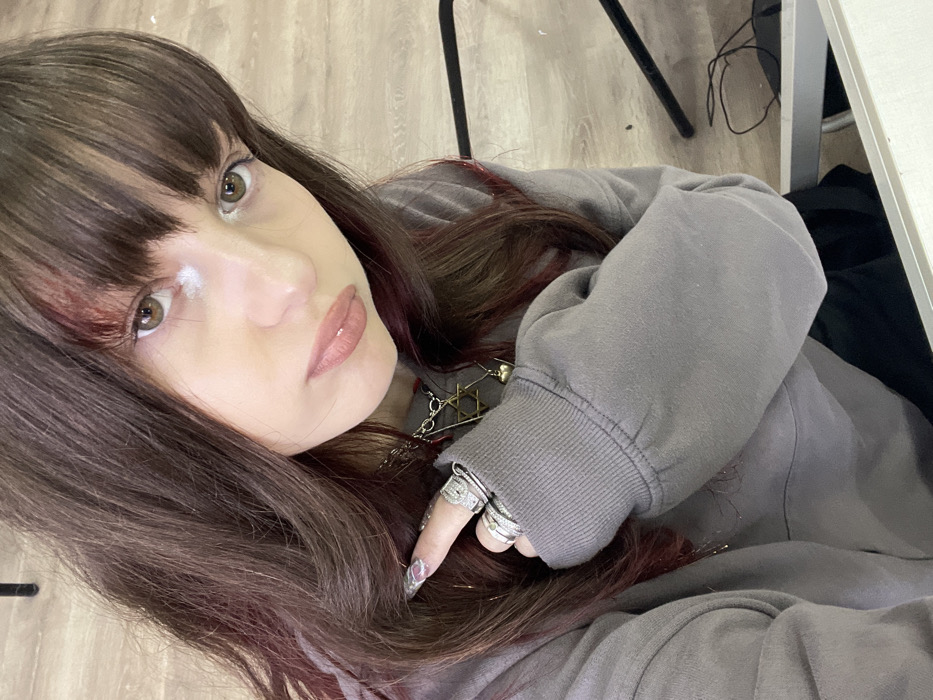 A female individual is depicted in an indoor environment. She appears to be a young adult with long, dark brown hair featuring reddish undertones and frontal bangs. Her eyes are light brown. A white substance is present beneath the inner canthus of her right eye. Her lips exhibit a light pink coloration. She is wearing a grey long-sleeved sweatshirt. Her left hand is positioned prominently, displaying multiple rings on the index, middle, and ring fingers. The nail on her left index finger is elongated, pointed, and adorned with decorative elements. Several necklaces are visible around her neck, featuring pendants including a Star of David and a small heart, along with a small red bead. The individual is looking directly into the camera. The background consists of light-colored flooring. Visible objects in the lower right background include a black furniture leg and black electrical wiring. A reflective surface is partially visible in the lower right foreground. No specific identifying features of a location within the city of Raanana, Israel, are discernible from the image.