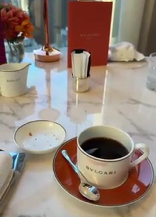 table setting with a cup of coffee, a small plate with crumbs, and a creamer jug labeled "Dolci". A Bulgari menu stands behind the setting. The camera then pans to a window revealing a view of a building with a grid-like facade. The shot widens to reveal a high-ceilinged room with large windows, tables with floral arrangements, and a Christmas tree in the background. The room appears to be a restaurant or cafe with modern decor.