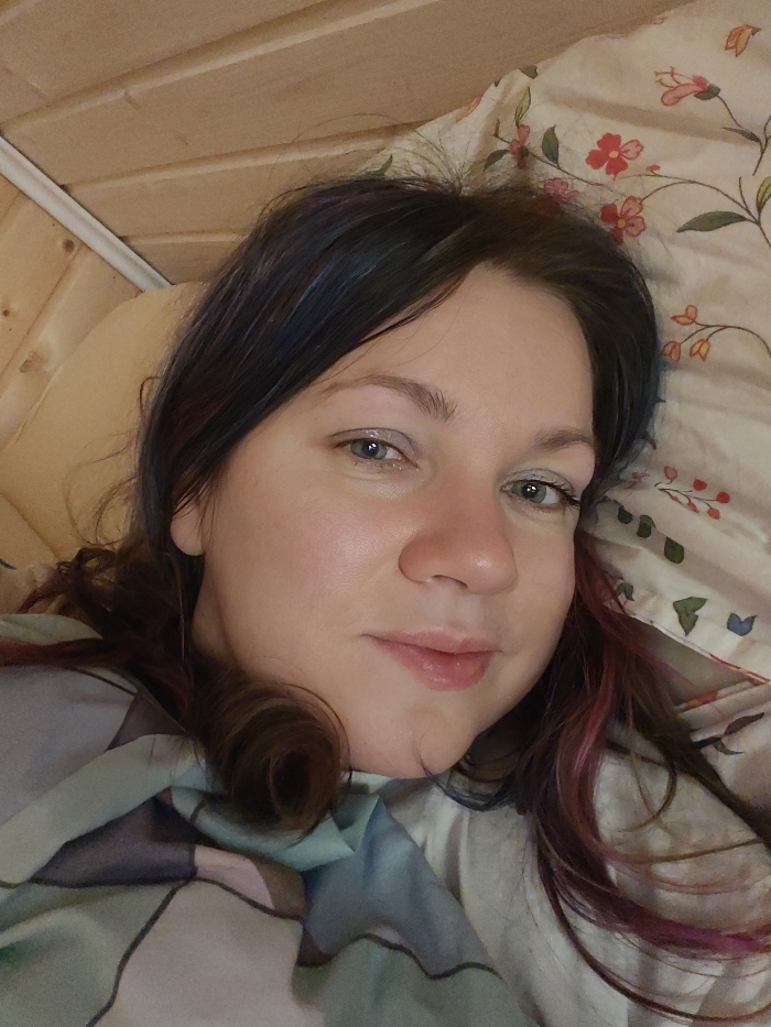 A female individual is depicted in a close-up, chest-up perspective, lying down indoors in Свистуха (кузяевский С/о), Russia
