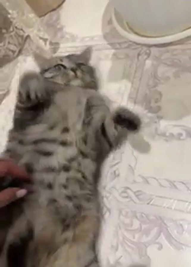 silver tabby cat lying on its back on a tiled floor. A hand reaches out and pets the cat on its belly. The cat rolls around and looks at the hand. There is a flower pot and a curtain in the background.