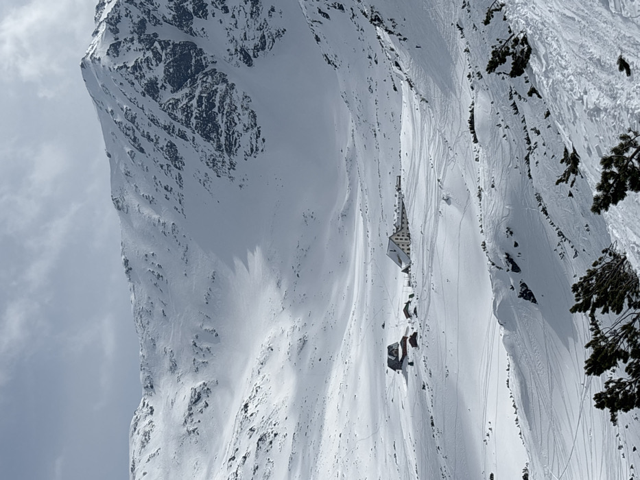 A panoramic view depicts a vast, snow-covered mountain valley situated in the Rila Mountains, near Samokov, Bulgaria. Steep, rocky mountain slopes, entirely blanketed in white snow, dominate the background and frame the central valley. The sky overhead is partially overcast with varying shades of grey clouds. In the midground, a complex of multiple buildings is visible on the relatively flat valley floor. The most prominent structure is a multi-story building with a light-colored facade and a dark, steeply pitched roof, featuring numerous windows along its visible side. To its left and slightly behind, another multi-story building with a darker roof is present. Several smaller, darker auxiliary structures are clustered around these two main buildings. The snow-covered ground surrounding the buildings and extending across the valley floor shows numerous crisscrossing ski tracks, indicating recent human activity related to winter sports. In the immediate foreground, partially buried, dark-green coniferous shrubs or low-lying trees are visible against the snow. No individuals are discernible within the frame. The scene is characterized by extensive snow cover, suggesting a winter or early spring high-altitude environment.
