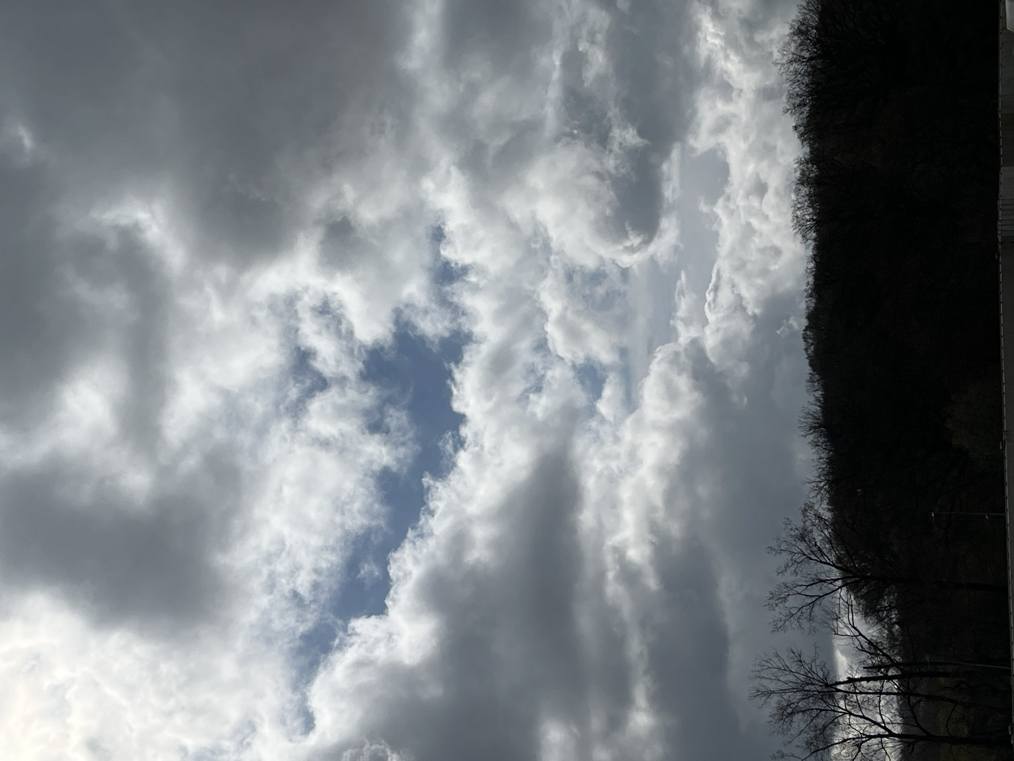 The scene is observed in Leudelange, Luxembourg. The upper two-thirds of the vertical image frame are dominated by a dynamic sky featuring an arrangement of dark grey and lighter white cumulus clouds. Interspersed within the cloud cover are visible patches of clear blue sky, notably in the upper-central and mid-left areas. The lower third of the image depicts a dark, silhouetted tree line composed primarily of deciduous trees with bare or sparsely leafed branches. Several distinct individual bare trees are visible on the far left, silhouetted against the brighter sky. A faint, dark horizontal barrier or wall is discernible at the very bottom edge of the frame. A single street light pole is faintly visible within the dark tree line towards the center-right. No individuals, specific actions, or interactions are present. The ambient lighting suggests a partly cloudy or overcast day.