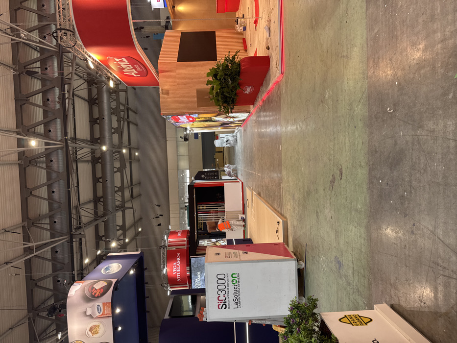 The scene depicts an interior view of an exhibition hall, specifically within the Fira de Barcelona Gran Via convention center in l'Hospitalet de Llobregat, Spain. The hall is in a state of active setup or dismantling, characterized by incomplete exhibition stands and scattered materials. The environment features a vast concrete floor, displaying variations in color and texture, with visible scuff marks and debris. The high industrial ceiling is constructed with exposed metal trusses, overhead lighting fixtures, and large cylindrical ventilation ducts. One individual is visible in the mid-ground on the left, positioned near a partially constructed booth. This person is wearing white protective overalls and an orange safety vest, standing with their back to the camera, appearing to be working on a raised wooden platform. On the left side of the frame, a white mobile unit on wheels is prominent, labeled "SIC3000 SERVICIOS INTEGRALES CORPORATIVOS LA SOLUCION CARPINTERIA EFIMERA" in red and green text. A silver ladder leans against this unit. Above, a circular red banner suspended from the ceiling displays "VEGA SOTUELAMOS" repeatedly, and further back, a blue and white suspended banner features various food images. In the foreground on the far left, a white planter with "GRANA PADANO" branding is partially visible, containing green foliage. On the right side of the frame, another exhibition stand is under construction, featuring light wooden paneling and a central black display area. A red planter containing green foliage, labeled "Albéniz Quesos," sits on the edge of this stand's raised platform. A red LED light strip illuminates the base of this structure. Overhead, a large curved red banner is suspended, displaying "Albéniz Quesos" in white text. The overall lighting is provided by the overhead fixtures, illuminating the various structures and casting mild shadows. The scene conveys an active work environment preparing for or concluding a trade show event.