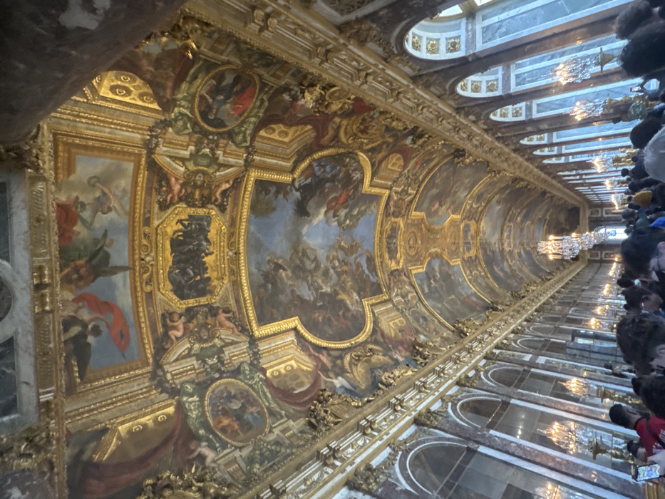 This image depicts the Hall of Mirrors (Galerie des Glaces) inside the Palace of Versailles, located in Versailles, France. The scene is characterized by a grand, elongated hall with a high, vaulted ceiling extensively adorned with numerous large frescoes depicting allegorical and mythological scenes. These paintings are framed by elaborate gilded stucco and moldings, featuring motifs of classical figures and ornate scrollwork. Multiple large, multi-tiered crystal chandeliers hang prominently from the ceiling, illuminated. The walls of the hall exhibit tall, arched structures; on the left, these appear to be large mirrors reflecting light and architectural elements, while on the right, they are tall windows allowing natural light to enter. These arches are interspersed with pilasters composed of mottled green marble with gilded Corinthian capitals. The lower third of the image is occupied by a dense crowd of people, primarily visible from their heads and shoulders upwards. Individuals in the crowd are observed looking upwards at the ceiling or forward along the hall. Some are holding smartphones, likely engaged in photography or recording. The lighting is bright, illuminating the architectural and artistic details of the interior.