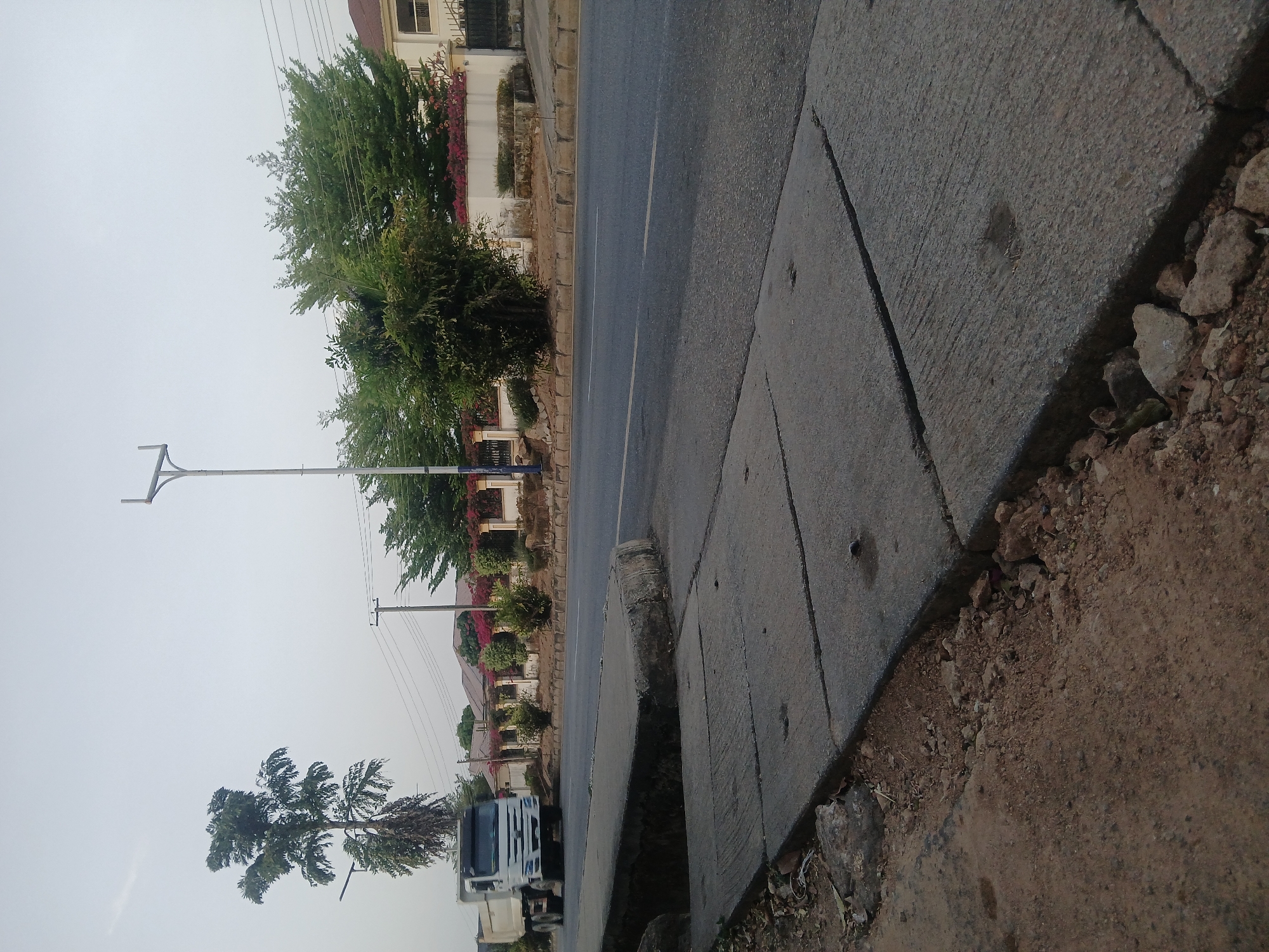 The image presents a roadside scene in Jos, Nigeria, viewed from ground level