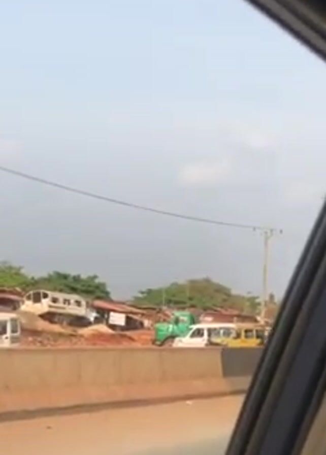 A person is driving in a car. A green Mack truck pulling a yellow dump trailer is seen on the road, expelling black smoke. The trailer is empty. Other cars and vans are on the road and some buildings are in the background.