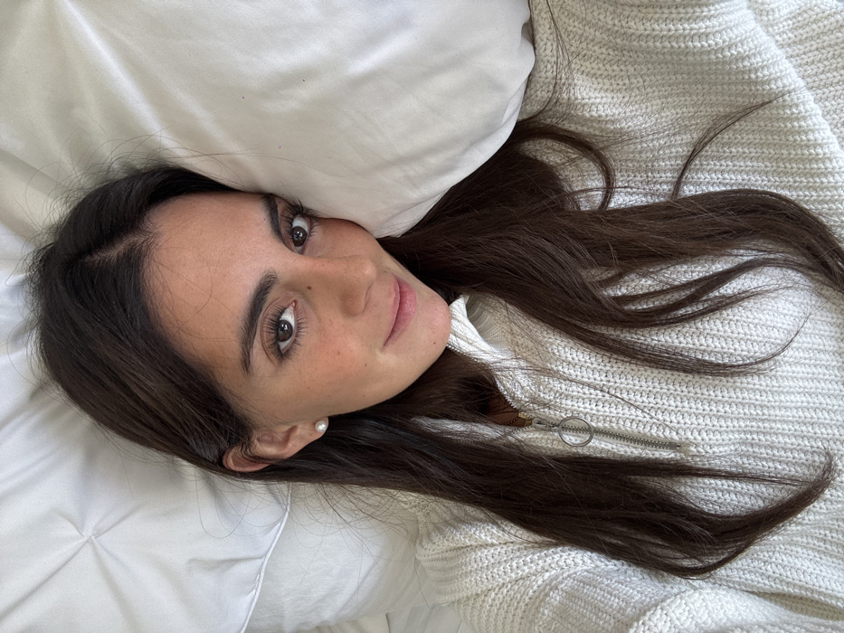 A woman reclines against a white pillow, her dark brown hair spread beside her on a white knitted sweater