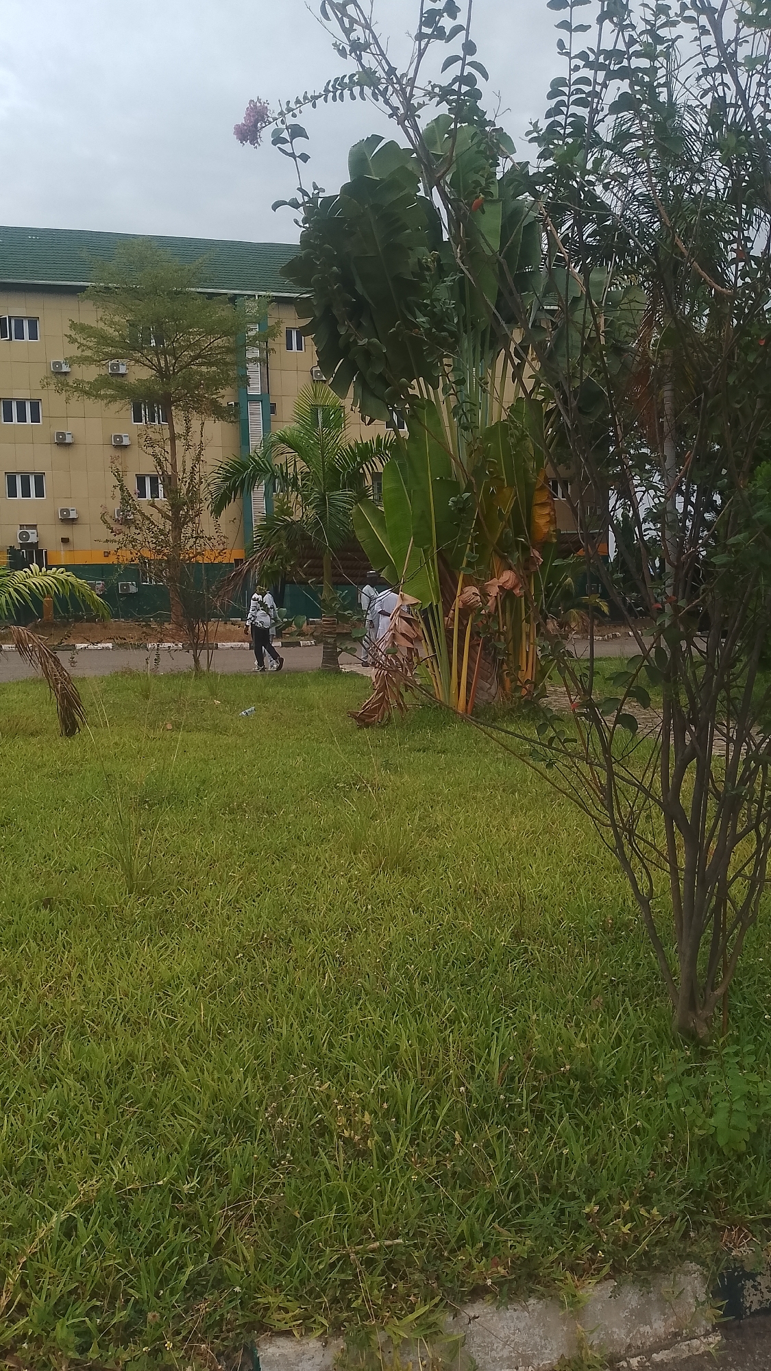 The image depicts a grassy lawn in the Immigration Quarters, Nigeria. In the background is a multi-story building with a green roof and beige walls. Air conditioning units are visible on the exterior of the building. Three people are walking on a paved area in front of the building. The foreground contains a grassy lawn with various plants, including small trees and leafy vegetation. A concrete curb is visible at the bottom of the frame. The sky appears overcast.
