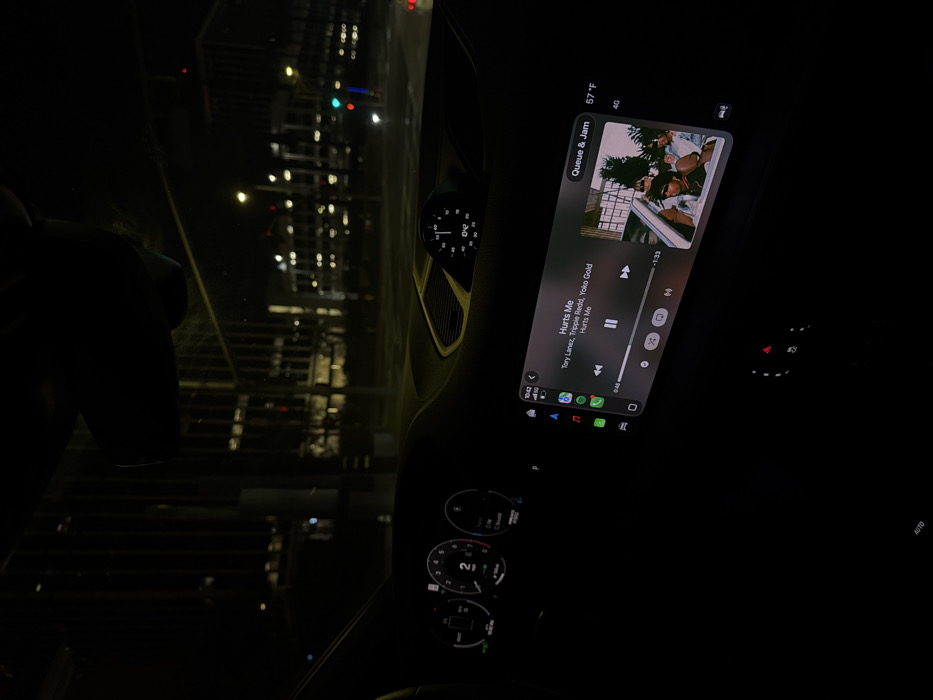 The image depicts a car's dashboard at night. The infotainment system displays the song "Hurts Me" by Tory Lanez, Trippie Redd, and Yoko Gold on Spotify. The time is 10:42, with 57°F displayed. The car's instruments are visible, with a dimly lit speedometer and other indicators. Outside the car window, blurred city lights suggest nighttime driving in an urban environment.