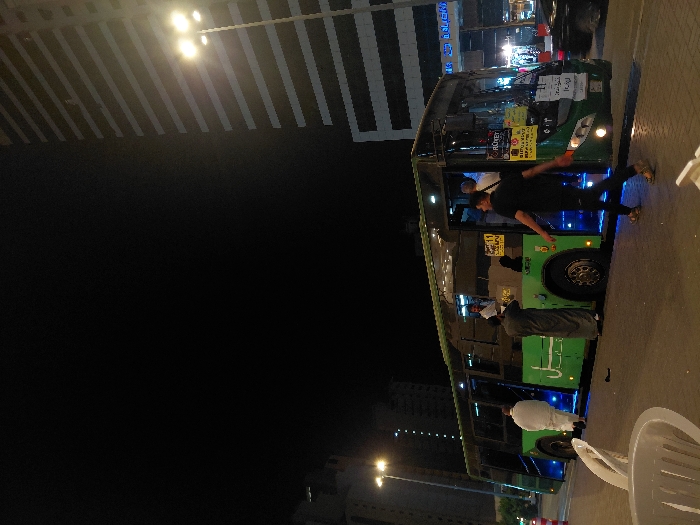 At night, a green city bus sits on the curb, its interior aglow with blue lights. Passengers are boarding, including a man in dark clothing who is mid-stride. Another individual stands in traditional white robes. The backdrop reveals a high-rise building with lit windows and overhead streetlights, suggesting an urban environment. A white plastic chair is visible in the foreground, adding a casual element to the scene.