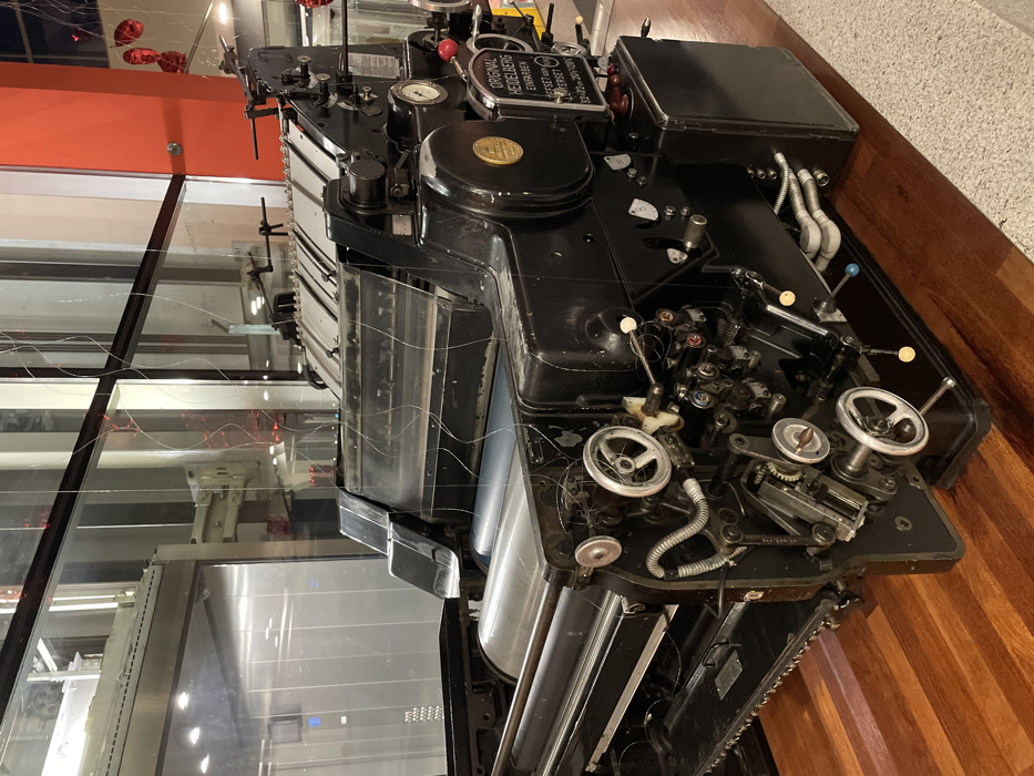 - "The image displays a static, dark-colored Original Heidelberg offset printing press positioned on a polished wooden floor" by FM-oln9s2, licensed under CC BY 4.0