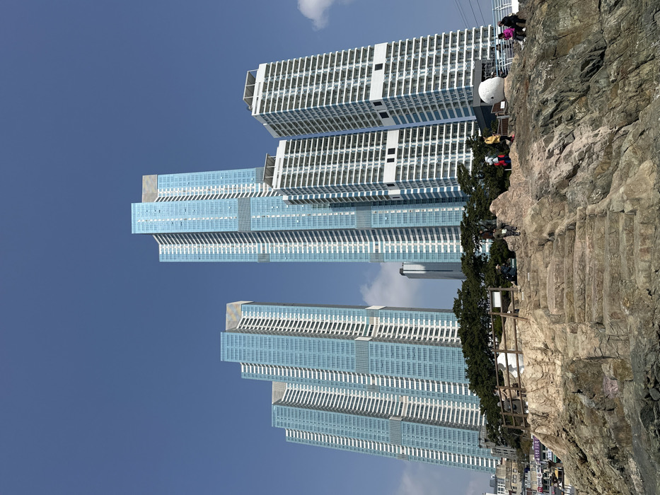 The scene depicts an urban coastal landscape in Busan, South Korea, specifically from an elevated position near Mipo Port or Haeundae Beach, looking towards the high-rise developments of Marine City or Haeundae LCT The Sharp. In the immediate foreground, a large, textured rock formation, primarily composed of grey and brown strata, occupies the lower portion of the image. Several wide, irregular steps are carved into this rock, ascending towards a flatter area in the midground. Above this rocky base, a dense line of dark green, evergreen trees extends horizontally. Behind these trees, a light-colored wooden fence or railing is visible, bordering a pathway. Approximately eight to ten individuals are present on this elevated pathway. They are dressed in casual attire; some are standing, while others are seated on benches or ledges. Noteworthy figures include one person in a bright yellow jacket and another in a red jacket. On the far right of this pathway, a large, smooth, white, ovoid sculpture is positioned. The background is dominated by a cluster of numerous modern skyscrapers, characterized by extensive blue-tinted glass facades and white or light-grey structural elements. These buildings vary significantly in height and architectural detail, forming a dense urban skyline against a clear, bright blue sky with minimal scattered white clouds in the upper right. Faint utility poles and wires are visible near the ground level on the far right.