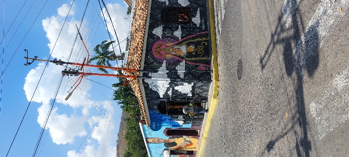 A colorful, artistic building sits beside a street. The building's walls are adorned with murals and artwork, contrasting with the surrounding urban environment. Power lines and a utility pole stretch across the sky, intersecting the view. In the background, a mountain is visible. The building's roof appears to be tiled. A shadow of a pole is visible on the road.