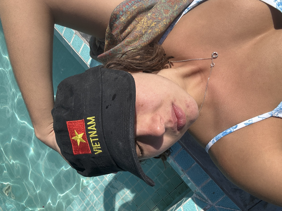 - "A person wearing a blue and white floral bikini and a black baseball cap with the Vietnamese flag and the word "Vietnam" embroidered on it lies beside a pool" by FM-bmo3E3, licensed under CC BY 4.0