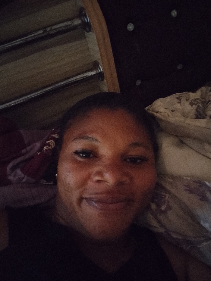 An indoor photograph depicts an adult female subject, observed from the chest up, positioned centrally in the frame. The subject has dark skin, dark hair, and is looking directly at the camera with a subtle smile, wearing a dark-colored top. The upper left background reveals a light-toned wooden structure with two parallel silver-toned metal rails. To the upper right, a dark, tufted headboard or panel with several reflective button-like embellishments is visible. A folded, patterned fabric (reddish-brown and light) is partially visible behind the subject's left shoulder, and a light-colored, patterned pillow is positioned near her right shoulder and head. The subject appears to be in a reclining position. The environment is consistent with a private bedroom setting within Unknown, Unknown.