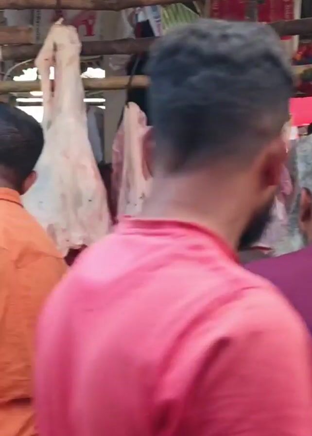 bustling market environment. Initially, a butcher in a maroon shirt stands near hanging cuts of meat at a stall. Another individual walks past in an orange shirt. The scene shifts to a woman sitting on the ground next to a large metal pot, with several people surrounding her. A person in a grey plaid shirt is leaning over, apparently stirring something in the pot with their hand.
