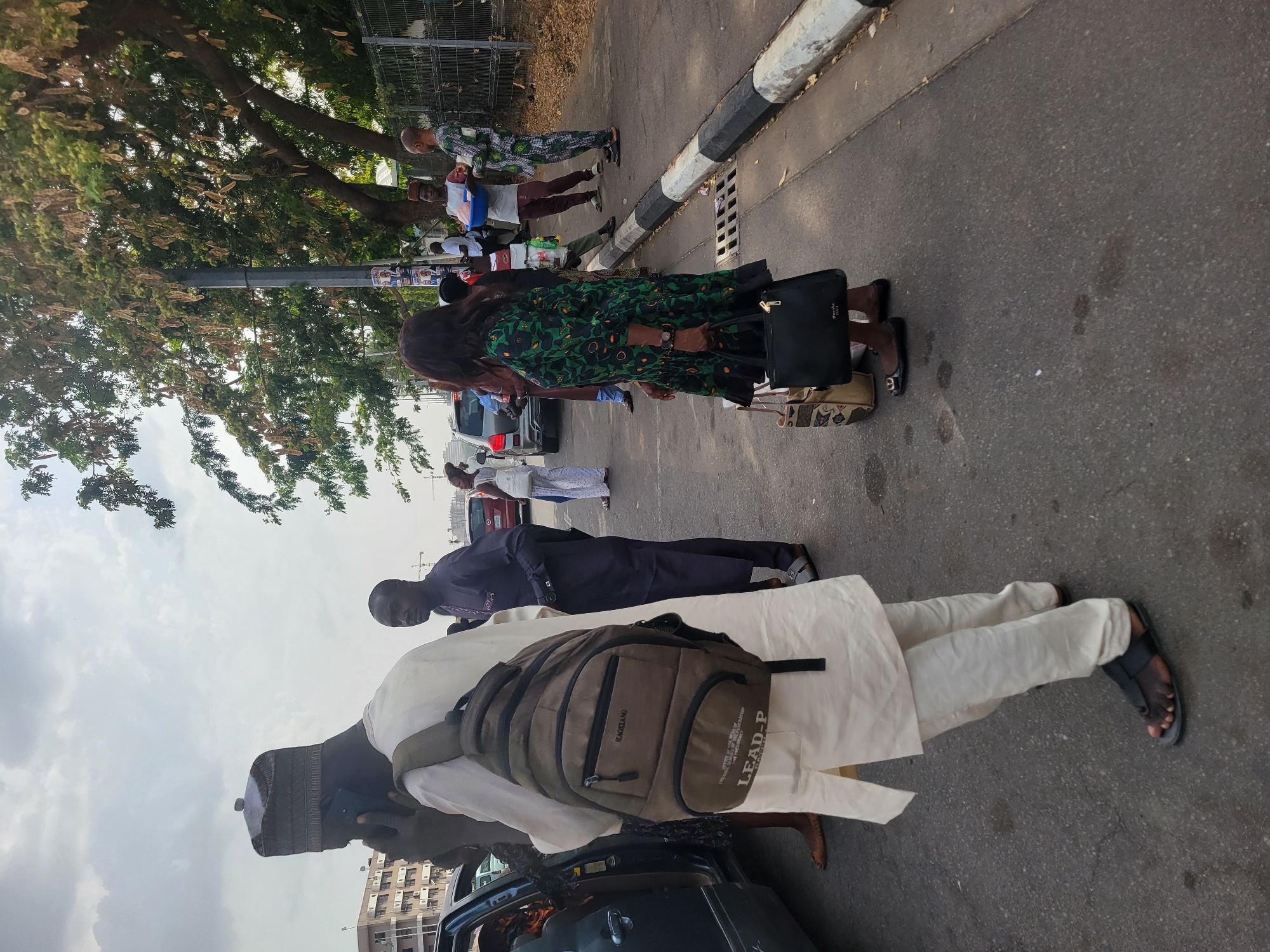 A street scene in Abuja, Nigeria shows a diverse group of people gathered on a paved road with parked cars visible. In the foreground, a man in a traditional white outfit and cap is wearing a backpack. Behind him, a man in a dark purple outfit stands beside him. A woman in a green floral dress with a black handbag is also in line. Further back, other individuals in various outfits can be seen. The environment includes trees, a black and white curb, and buildings in the distance. The overall impression is a crowded street with people waiting.