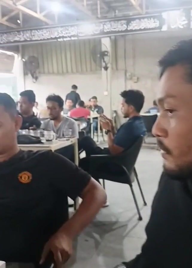 interior of a restaurant or cafeteria. Several men are seated at tables, most are casually dressed. One man wears a Manchester United soccer jersey. Some men are looking at their phones, others are talking. There are glasses and what appear to be small cups on the tables. A man in a black turtleneck is filming the scene. The building has a high ceiling with exposed beams. There are fans mounted on the walls and windows letting in light. A decorative frieze with Arabic writing runs along the top of the wall.