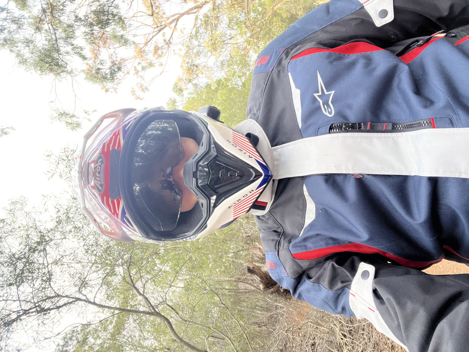 The image captures a selfie-style, waist-up view of an individual wearing motorcycle gear in a natural, wooded environment within the city of Tangier, Morocco. The person is equipped with an Airoh adventure-style full-face helmet, predominantly white with red and blue accents, featuring a clear visor, internal goggles, and a prominent chin vent. Below the helmet, the individual wears a navy blue, red, white, and black Alpinestars motorcycle touring jacket. The jacket displays a white central flap covering a zipper, a black zippered pocket with a red pull tab on the right chest, and a white Alpinestars star logo on the right side. The background features light-green foliage and thin tree branches against a bright, overcast sky. On the left side, reddish-brown earth is visible, suggesting an unpaved trail, alongside a partially obscured dark, irregular object resembling a tree stump or log. The overall scene indicates an outdoor excursion, likely an off-road motorcycle ride.