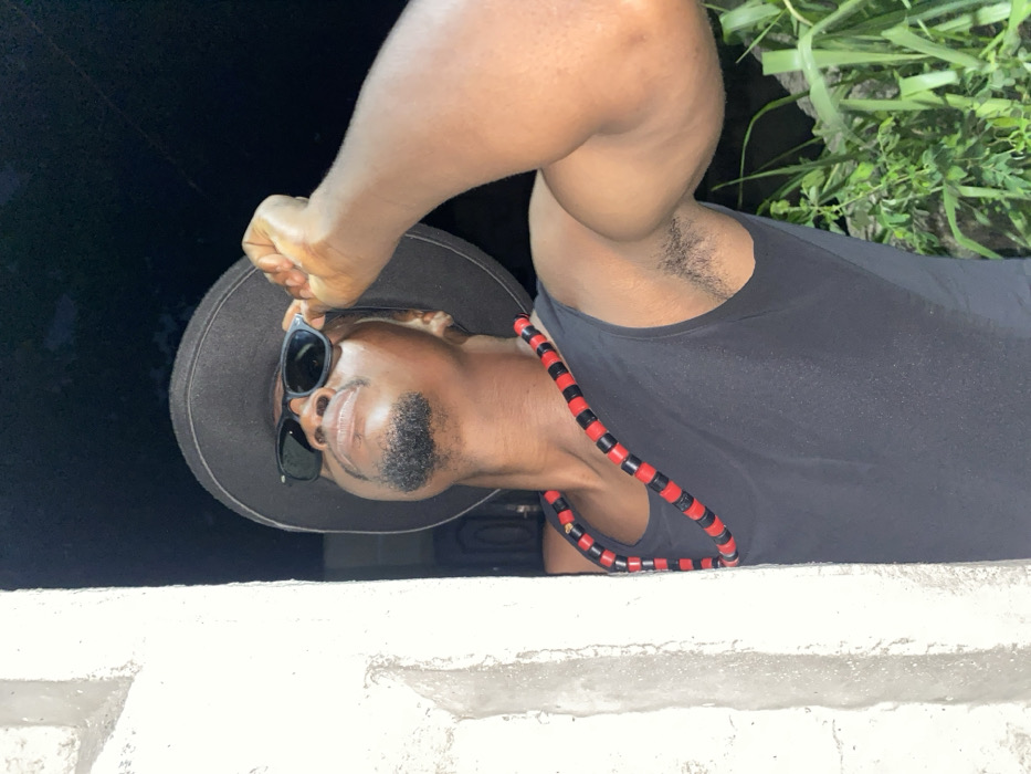 A muscular man wearing a black tank top, hat, and sunglasses poses with his arm bent above his head. He has a dark goatee. A red and black necklace adorns his neck. He leans against a white concrete ledge. Behind him, vegetation contrasts the darkness to his left. His expression is relaxed, with a slight smile.