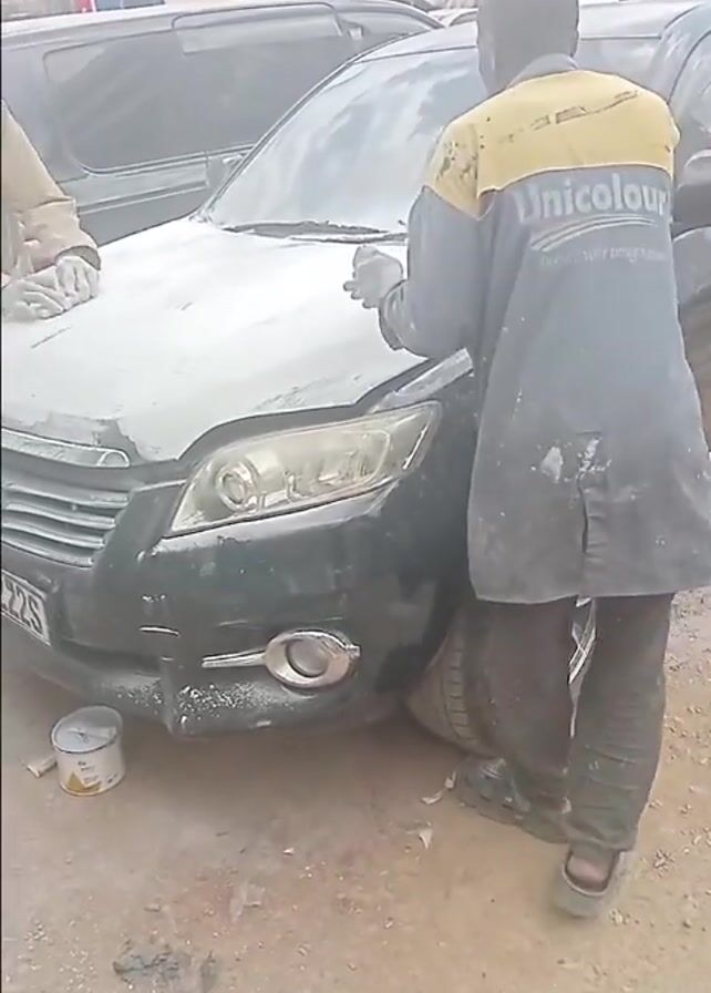 Two men are sanding the hood of a black Toyota RAV4 in an outdoor setting. The men are wearing work clothes, and the hood is covered in white dust, presumably from the sanding. A third man walks past in the background. The environment appears to be a repair shop or auto body shop, with other vehicles visible in the background. There's a can of something next to the car, and the ground is dirt and debris. The car's license plate is partially visible.
