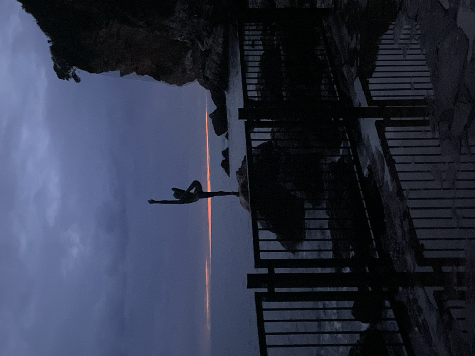 A silhouetted figure extends horizontally from a rock formation towards a sunset-tinged sea. Above, the sky is a gradient of dark blue and grey clouds. The figure's limbs are outstretched, creating a balanced pose. A dark, weathered structure with railings sits to the right, partially obscuring the view. A rocky cliff face looms in the upper left corner, completing the rugged coastal scene.