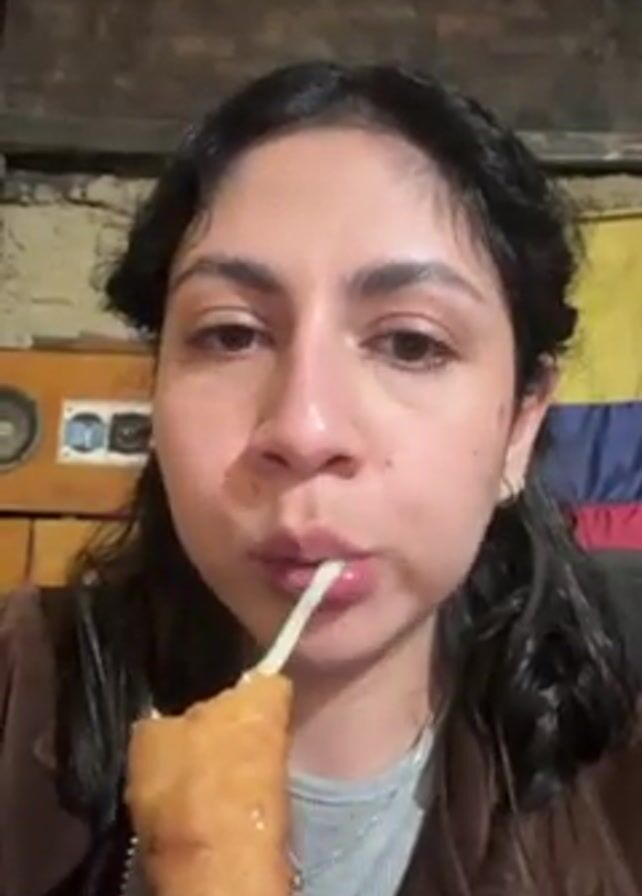 A person with long dark hair held back by a braid is eating a fried snack. The snack appears to be long with a golden brown crispy exterior and filled with molten white cheese which can be seen stretching as the person bites into it. The person is wearing a brown jacket over a gray shirt and a silver necklace. A Colombian flag is visible in the background along with an old-fashioned radio and a wall of rough hewn planks. The room seems dimly lit. The video focuses on the person's face as they eat the snack and smile slightly.