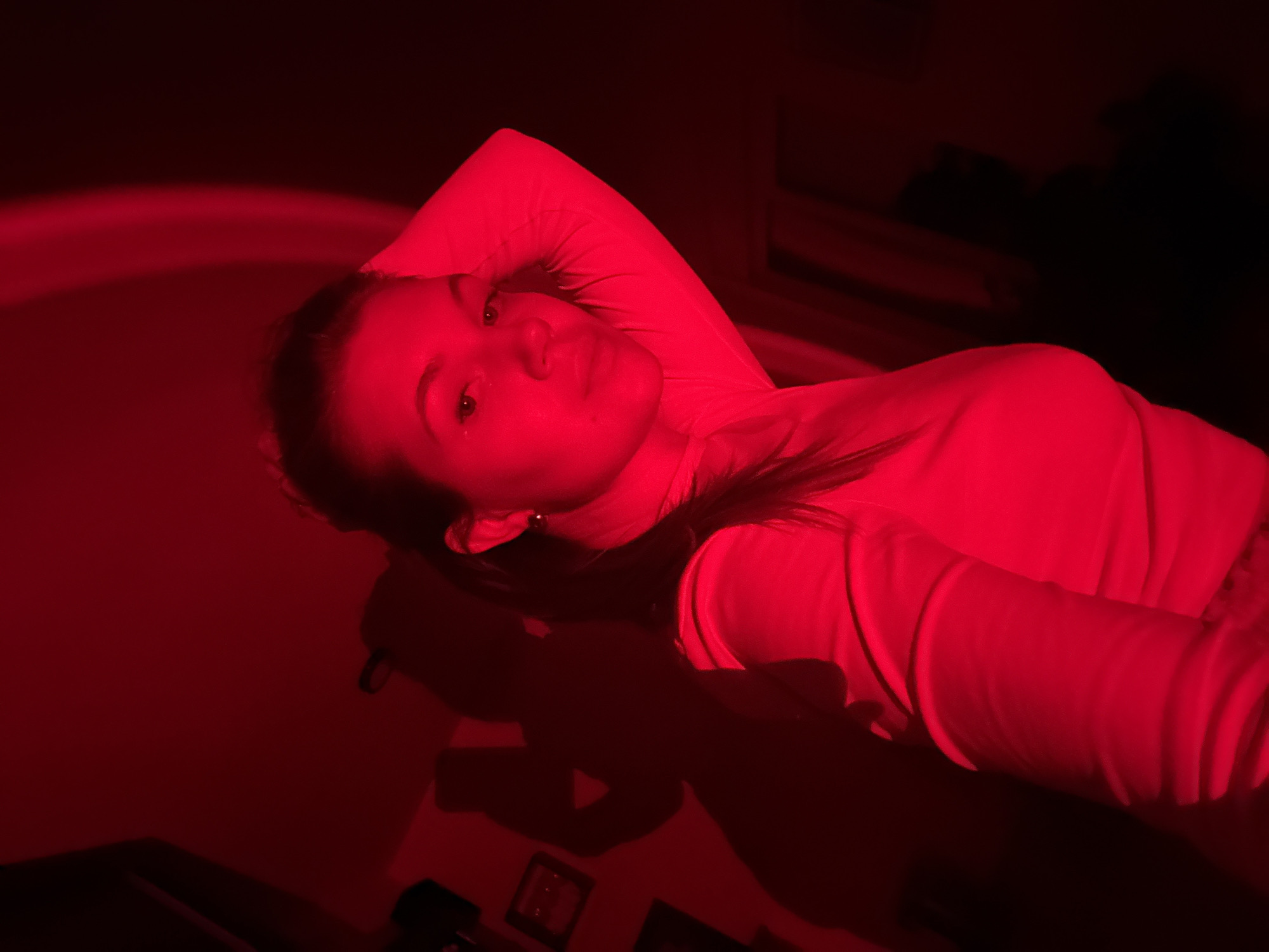 The image captures an indoor scene dominated by pervasive red illumination, likely from an artificial light source producing a prominent reddish-orange arc visible in the upper right background