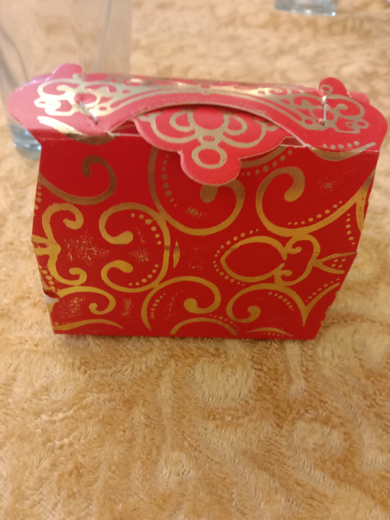 A small, red, rectangular decorative box is centrally positioned on a textured, light beige or pale orange fabric surface. The box features intricate gold-colored scrollwork and dot patterns on all visible sides. Its top flap, also red with gold patterns, includes a semicircular cut-out and a small, silver-colored staple or clasp securing one end of the handle-like structure. A slight tear or crease is visible near the staple on the left side of the handle. The fabric surface beneath the box displays a distinct, irregular, wavy texture, consistent with a napped material like a blanket or plush tablecloth. In the upper left background, a blurry, translucent object, possibly a glass or bottle, is partially visible and out of focus. No individuals, actions, or direct interactions are depicted. The scene is located in the city of Kot Bhattian, Pakistan.
