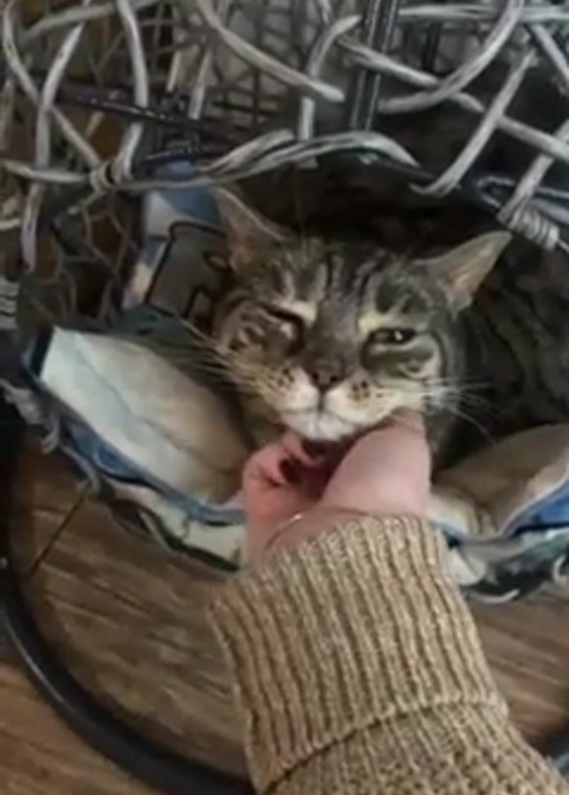 A close-up shot shows a brown tabby cat lying in a small, round, woven chair or basket, lined with a light blue patterned cushion. A hand wearing a tan knit sweater gently strokes the cat’s head and neck. The cat appears relaxed, eyes mostly closed. The chair sits on a dark brown, possibly wood, floor. The wicker of the chair is visible, creating a pattern of light and shadow around the cat.