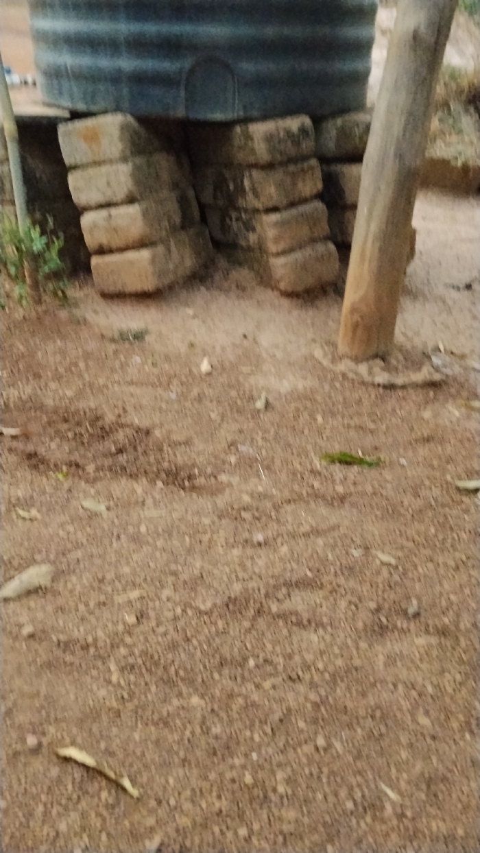 The scene, located in Isieke, Nigeria, displays an outdoor water storage setup. A large, dark grey, horizontally ribbed water tank is elevated, supported by a structure of stacked rectangular concrete blocks. Four blocks are visibly stacked vertically on the left, forming one support pillar, while additional blocks comprise a second support section to the right, partially obscured by a thick, light brown wooden post or tree trunk. A slender, lighter-colored vertical pole stands to the far left of the tank support, with a small patch of green vegetation at its base. The ground consists of reddish-brown, loose earth with scattered small pebbles and dry organic matter. No individuals, actions, or specific interactions are present in the image.