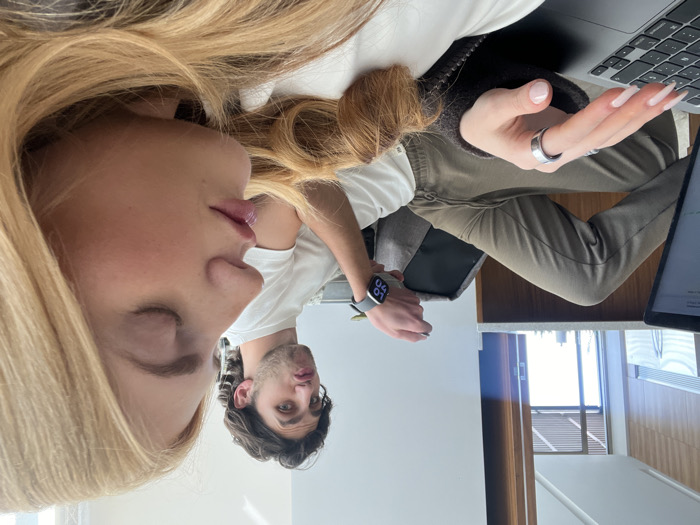 A couple is captured in a casual setting. A blonde woman with long hair is prominently featured in the foreground, her eyes closed. Behind her, a man with dark hair looks at the camera. They are seated with laptops and a tablet visible. The woman has a ring on her finger. A digital watch is also visible. The setting appears to be indoors, possibly a living or workspace with a door and windows in the background.